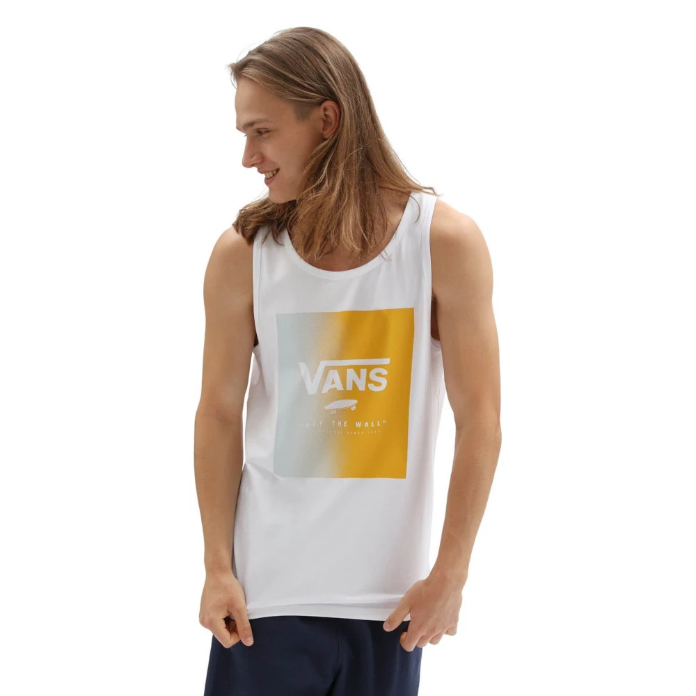 La Canotta Vans Print Box Tank White Ballad Blue è uno smanicato classico da uomo realizzato in morbido cotone pettinato filato ad anelli 185gm ring spun con la classica scritta logo a contrasto su davanti.