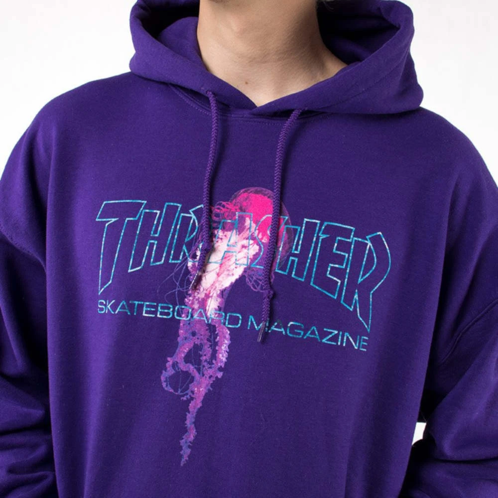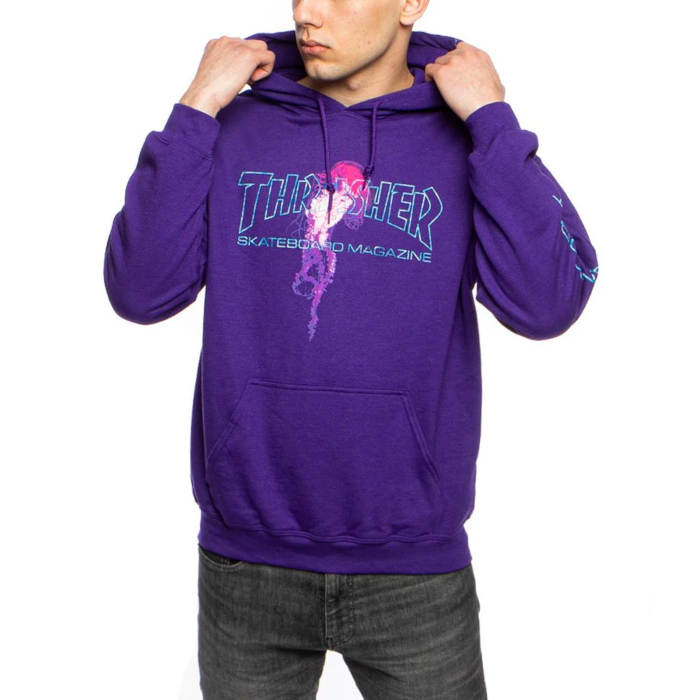 La Felpa Thrasher X Atlantic Drift Hood Purple è una felpa viola con cappuccio di Thrasher in collaborazione con Atlantic, logo frontale stampato e tasca centrale.