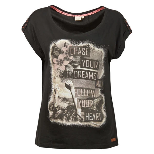 La T-shirt a Maniche Corte Protest Jennifer True Black è una maglietta in cotone da donna con una bella stampa fotografica di scarico sul davanti, maniche arrotolate con ricami in tessuto e bottoni rivestiti in tessuto.