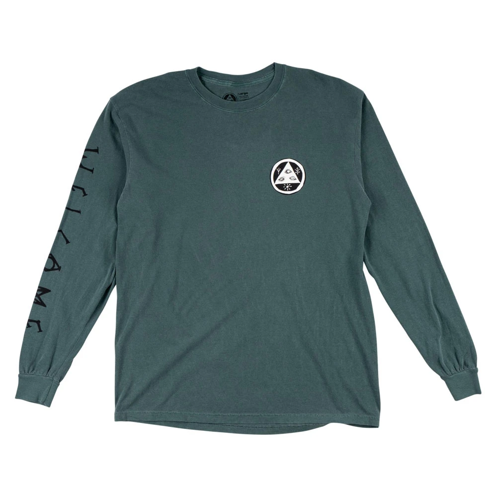 La T-shirt Longsleeve Welcome Sloth Garment Dyed Sprut in Jersey di cotone, vestibilità regolare, t-shirt a maniche lunghe con stampa sul petto a sinistra, stampe sulle maniche e stampa grande sul retro.